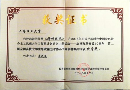 近日,由浦京官网第一届“初心杯”文创作品大赛组委会报送的学生作品《神州风采》(作者为能动学院学生鲁成龙)荣获教育部高等学校思想政治理论课教学指导委员会组织的庆祝改革开放40周年·第二届全国高校大学生思政课艺术作品主题创作展“优秀奖”。