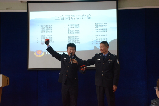随后,“网红”黄超警官、魏海岭警官通过相声、快板、演说多形式揭露身边常见的“套路”。例如将手机验证码转发给他人导致个人钱款被盗,微信陌生人加好友套近乎从而导致个人信息泄露等。两位警官通过诙谐的语言一一拆穿犯罪分子实施诈骗的惯用伎俩,生动有趣的表演带动了现场氛围,引发在场师生的深刻思考。随后,魏海岭警官通过案例与视频教学向大家展示商圈扒窃的常见手法,就当下期间需重点关注的防火防盗防骗防事故等主题安全知识进行专业讲解。他指出上下班高峰期、周末节假日、冬末初春是扒手作案的高峰时间段,而拥挤的公交车站、商场、饭店等是主要发生地点,呼吁大家在外出时要结伴而行,财物确保不离开视线。黄超警官围绕防火安全、国家安全等主题展开分享。关于防火,黄警官通过现场实地教学,讲解了灭火器的正确使用方法以及救火原则,纠正了大家平时使用灭火器的误区。