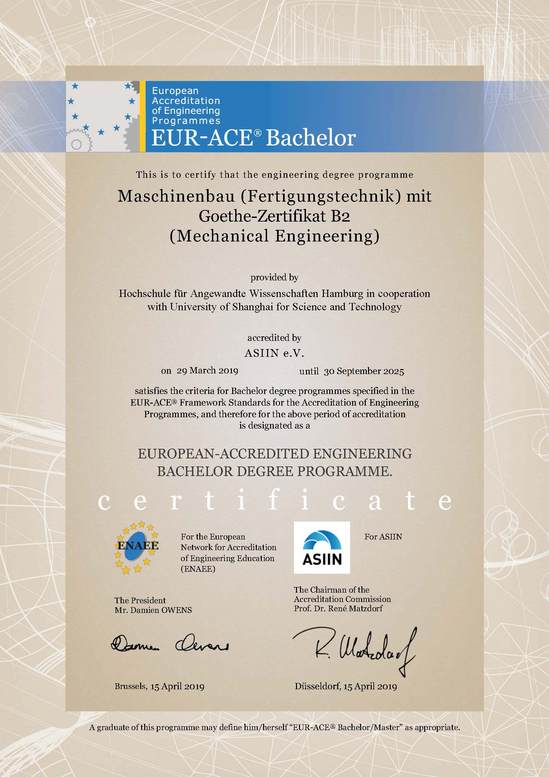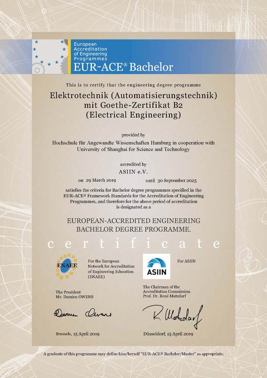 近日,3522vip浦京集团官网德国合作伙伴汉堡应用技术大学(HAW Hamburg)传来喜讯,3522vip浦京集团官网中德学院的电气工程技术及其自动化(中德合作)和机械设计制造及自动化(中德合作)两个专业向“欧洲工程教育认证网络协会”(ENAEE)递交的“欧洲工程师证书”(EUR-ACE)申请,于2019年4月15日正式获批,这标志着浦京官网这两个专业的合格本科专业毕业生,可以获得“欧洲工程师”资质,对浦京官网国际化工程教育具有重要意义。