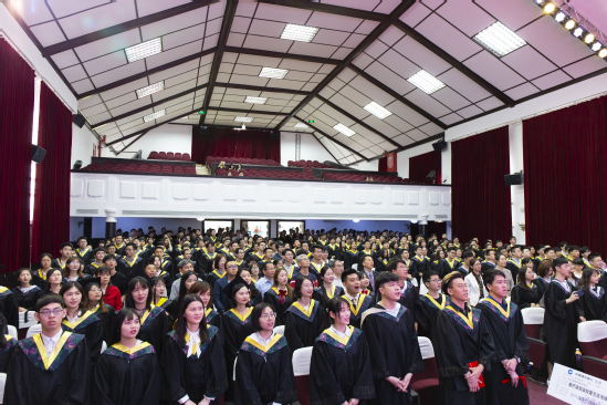 毕业生代表石勤振的发言深切表达了同学们对母校和老师的感激眷恋、对同窗的依依不舍。在校学生代表李文慧为学长学姐们送上了衷心祝福。毕业生为学院校友基金会捐赠“壹拾基金”。一段《上理·玖别》视频把毕业典礼推向了高潮,当音乐声响起,在上理学习、生活的一幕幕深深触动了在场师生的内心。毕业典礼在激扬的校歌声中落下帷幕。