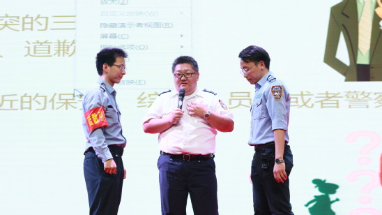 王永镇为现场的师生讲述了部分事故起因及情况,他以真实发生的安全事故为例,向同学们讲解了相关的应对方法。随后,他与两位上海民安的工作人员共同演示了产生冲突时进行化解处理的方法,提醒同学遇到冲突一定要保持冷静,注意隔离等。王永镇还随机邀请了两位同学为大家演示如何给陌生人指示路线,提醒同学们标志的重要性。同时他也以胶州路大火事件为例讲解逃生注意点等。