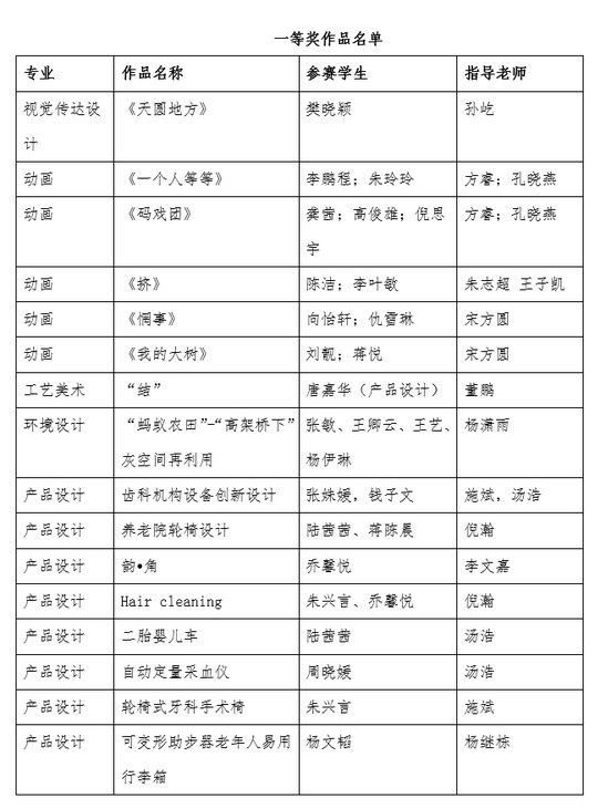 此次学院选送的参赛作品,涵盖了书籍设计、包装设计、媒体界面设计等多个方向,其中视觉传达设计系作品《天圆地方》、工艺美术系作品《结》、环境设计系作品《“蚂蚁农田”“高架桥下”灰空间再利用》、产品设计系《齿科机构设备创新设计》等8件作品,动画系《一个人等等》等5件作品,均荣获一等奖。