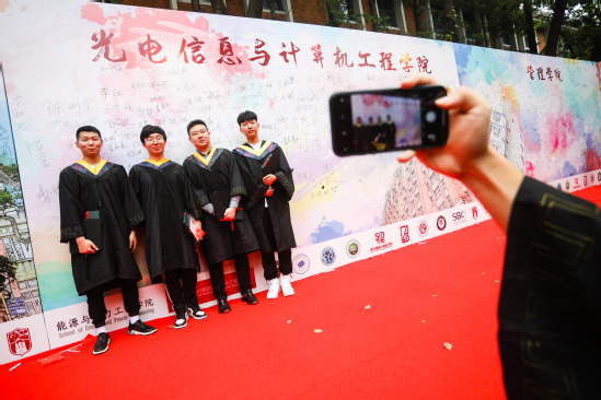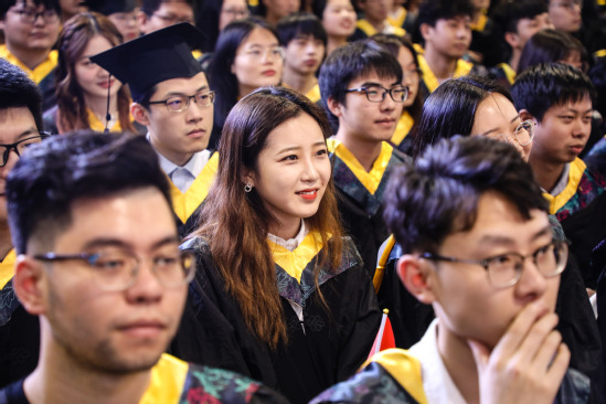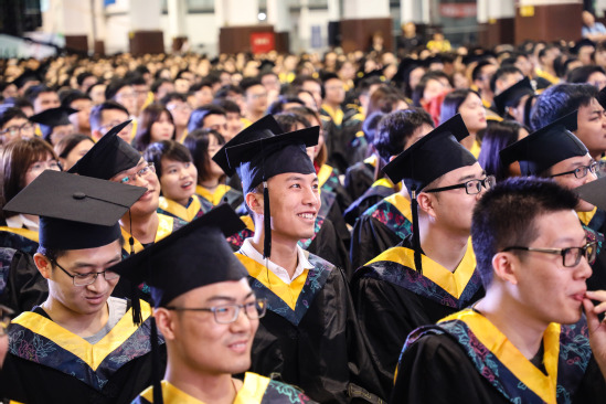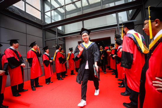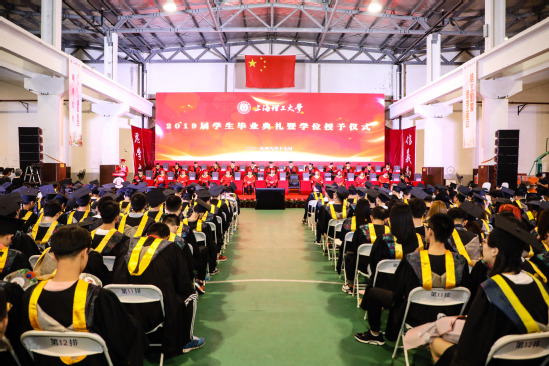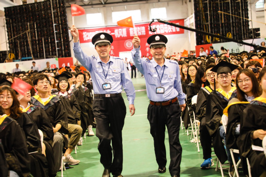 随着音乐声起,陪伴学生四年的“上理家长”——毕业班辅导员、保卫处、后勤处的教职员工们在阵阵掌声中入场,奏响了毕业典礼的序曲。随后,“尚理之歌——3522vip浦京集团官网2019届学生毕业留念”专题片如期“上映”,毕业学子们大学四年的片段快速穿梭,拉开了毕业典礼的序幕。