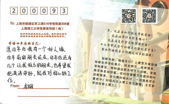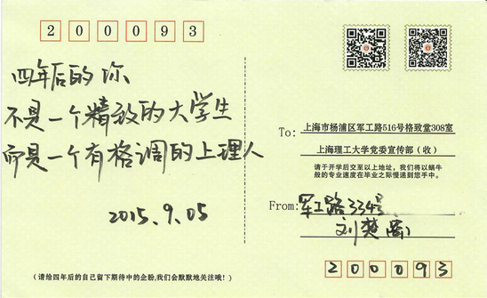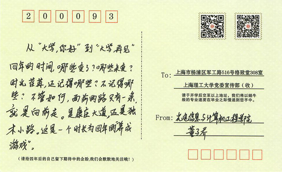 “做有格调的上理人”“在大学里不断进行自我‘升级’”“找到自己的兴趣方向”……四年前,如今的2019届本科毕业生还是刚入学的“萌新”,他们一笔一划在明信片上写下了对自己的初心。