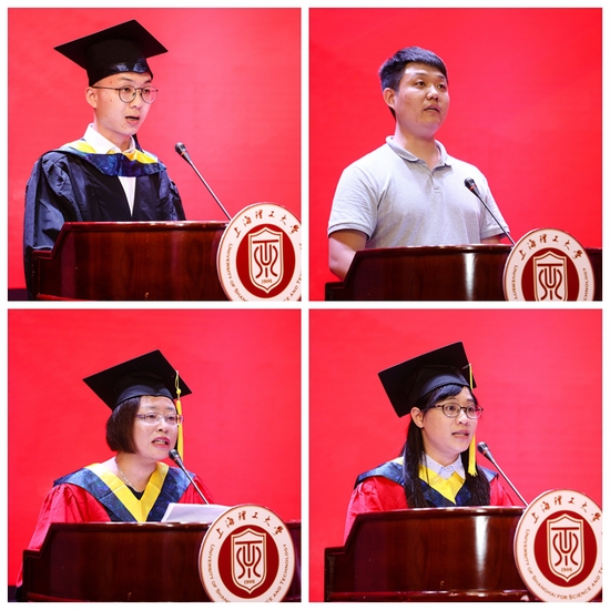 毕业生代表陈智贵、毕业生家属代表石清磊、校外教学点院长代表朱咏梅、教师代表顾秋洁相继发言。两位毕业生代表全体毕业生向学校赠送了“桃李满天下”的字匾,表达对母校的深深祝福。