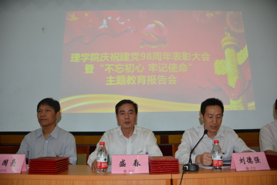 6月19日下午,理学院在管理学院五楼会议室召开庆祝建党98周年大会。学校党委副书记、副校长盛春和理学院全体党员参加了会议,会议由理学院党委书记刘德强主持。