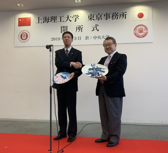 校党委书记吴坚勇与中央大学校长福原纪彦交换成立仪式纪念品