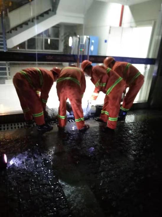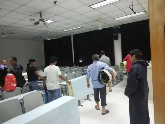 在后勤管理处设置值班室,生乐物业、东方大学城物业经理24小时在岗值班,后勤应急抢险人员随时待命。值班人员分校区、分区域每2小时对校园巡视一次。及时处置倾倒树木6株,扶正桂花、海棠等树木12棵,清扫道路,疏通雨水井。安排400余名施工工人到第四教学楼、体育活动中心临时休息,确保施工人员安全。