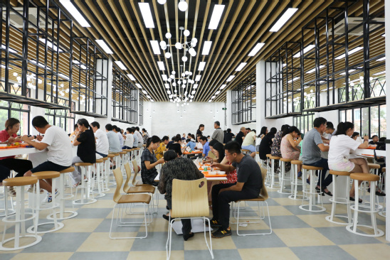 纯白色简约风格球形吊灯、六边形马赛克瓷砖贴面、哥特式火焰窗、红色建筑外墙……为了迎接新生,第二食堂也“旧貌换新颜”。这是一个“上理style”的高颜值存在,也是一个拥有“260+”座位容量的实力担当,可供师生们就餐、学习、休闲。食堂的设计方案就出自学校版艺学院环境设计专业的同学之手,他们把自己对学校的爱融在了设计的细节中。“我们走遍了校园的每一个角落来观察学校的建筑特色,从设计图到施工图,改了不下10稿。我们想让学弟学妹们一来就能感受到上理的文化之美。”尤依依说道。此外,针对苦于床铺太短的“身高特长生”,后勤管理处正贴心地为这些新同学打造“专属”加长床铺。