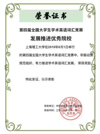 “第四届全国大学生学术英语词汇竞赛” 近期落下帷幕。来自管理、机械、能源等十个学院的289名上理学子参加了本次竞赛,并在外语学院学术英语教学团队指导下获得了优异成绩,陈昊澜等12位同学获得一等奖,李清卿等19位同学获得二等奖,陈诚等25位同学获得三等奖,20位同学获得“学术英语词汇量等级证书”,浦京官网被评为“学术英语词汇发展推进优秀院校”。