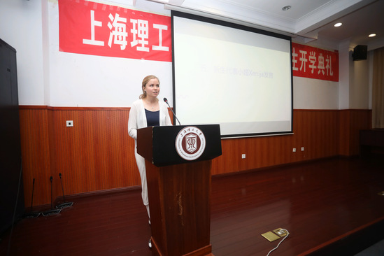 新生代表、来自哈萨克斯坦的管理学院德博士小娅在发言中讲到,自己从小对中国充满向往,喜欢中国文化,希望未来自己能和中国同呼吸、共命运。美丽的上理工校园环境给她留下深刻的印象,她深深地感谢所有给予她帮助的友好热情的师生。她表示今后一定会学好专业知识和中国语言文化,珍惜在上理的每一分每一秒,铺设好未来的每一砖每一瓦。