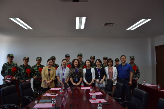 临近结束,在欢送进行曲中,学院领导为入伍新兵赠送了学院给他们精心准备的纪念品并合影留恋。