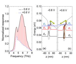 太赫兹量子阱探测器具有响应速度快、探测灵敏度高的优点,其探测机理是利用束缚电子吸收太赫兹光子,在半导体量子阱中子能带间跃迁,改变器件的电导率,从而实现对太赫兹辐射的探测。张桂雪同学与导师团队采用非对称阶梯量子阱结构,打破了子带跃迁选择定则的限制,大幅度提高了探测带宽。同时,团队还发现了该探测器的太赫兹响应谱与偏压极性相关。通过理论计算表明,这种偏压极性相关太赫兹响应谱来源于阶梯量子阱中波函数的不对称性,这为设计新型太赫兹量子器件提供了新的手段。该成果是在浦京官网高水平学科项目资助下取得。