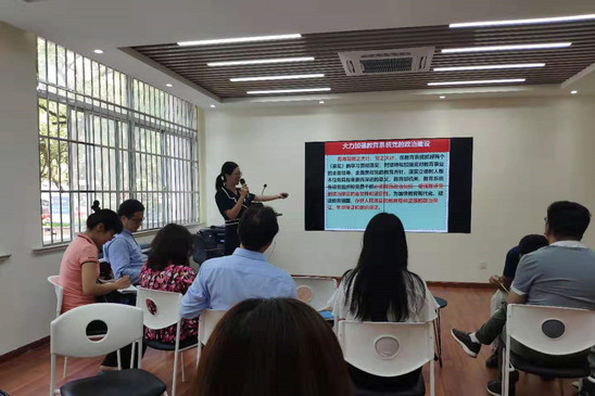 郑少东副教授作了题为《党支部政治建设与教育事业发展关系》的讲座。她结合国际国内环境讲解了党的政治建设的重要性与迫切性,从深入推进反腐败斗争的必然要求、坚持和加强党的全面领导的必然要求、全面从严治党向纵深发展的内在需要等方面进行讲解。她分析了高校意识形态工作面对的复杂形势,比如全球化所引发的制度价值冲突、市场经济深度推进所引发的一系列政治和文化问题、信息网络技术迅猛发展所带来的思想价值挑战等等。她还结合高校教育中存在的现实问题,讲解了在切实加强教育系统中党支部政治建设的主要方法,包括把党的政治建设摆在首位、发展积极健康的党内政治文化、把思想政治工作贯穿高校教育教学全过程,在学生中开展深入、持久、生动的爱国主义教育,让爱国主义精神牢牢扎根在学生的思想意识中。
