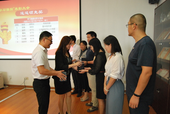 表彰活动充分利用“学习强国”学习管理系统,评选出总积分在8000分以上的“遥遥领先奖”6名、总积分在6000分和8000分之间的“渐入佳境奖”6名和近7日积分前10名的“天天向上奖”。图文信息党委书记孙萍、副书记陈世平和周亦敏为获奖学员颁奖。
