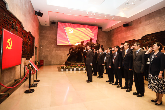 在纪念馆鲜红的党旗前,党委书记吴坚勇带领大家重温了入党誓词,牢记初心使命。随后党委领导班子一行参观了纪念馆主展厅和“为国旗而歌”主题展,在一幅幅历史图片、一件件珍贵实物前,大家认真听取讲解,不时驻足观看,从党的奋斗历程中体味党的初心使命。