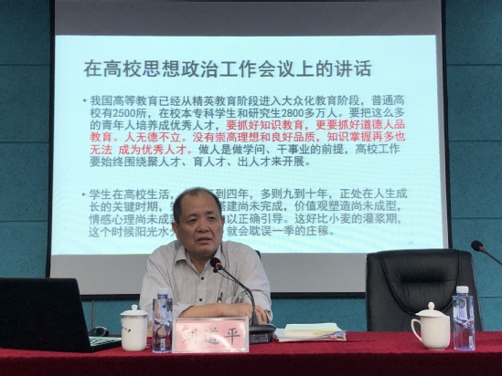 围绕立德树人根本任务,立足学校高水平大学建设目标,刘道平教授作了《提升德育意识 创新课程思政》为主题的专题报告。报告从社会主义教育“培养什么样的人?”“为谁培养人?”和“怎样培养人”的问题出发,高度概括了习近平总书记在全国高校思想政治工作会议、全国教育大会和学校思政课教师座谈会等会议上关于高等教育的系列讲话精神以及中央有关文件精神,结合学校发展实际,剖析了高校在思想政治工作、教师培养、教学实践以及学校管理层面存在的问题,回答了高校为什么要搞好课程思政以及推进三全育人工作的重大意义。