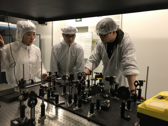 彭滟(左一)带领团队调试实验设备