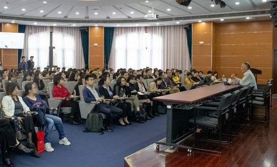 如此著作等身、硕果累累的一位“大咖”学者,一出场引来全场师生热烈欢迎。但他丝毫没有架子,一身朴素的夹克,向大家温和微笑、鞠躬致意,还向学生们抛出那句经典的自嘲:“你们是互联网的原住民,我是互联网的难民”,讲座全程亲和、幽默、风趣,数次引来笑声、掌声。