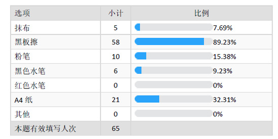 主题调研阶段,老师们提出了很多有利于学院发展的好建议,其中关于课堂的问题比较集中。针对课堂教学,黑板擦的需求高居榜首,达到了89.23%,都想有一块优质的黑板擦,在征求老师们的建议后,学院办公室根据教学需要,秉承为教师服务的原则,即知即改,立即为老师们按需购买黑板擦等教学用品。