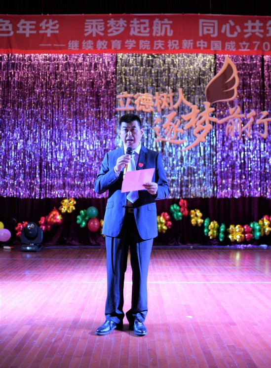 继续教育学院直属党支部书记、院长李建东首先致辞,对参加文艺晚会的所有演职人员致以衷心的感谢!他指出,在举国欢庆中华人民共和国成立70周年的喜庆气氛中,我们要坚持以习近平新时代中国特色社会主义思想为引领,守初心,担使命,坚持立德树人根本任务,锐意进取,为建设全民学习、终身学习的学习型社会而努力。