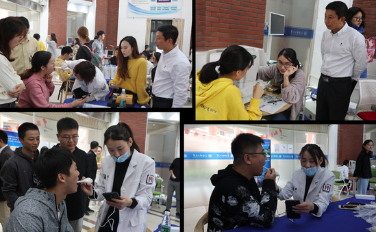 启动仪式开始后,企业代表介绍了相关企业情况,宣讲口腔保健和视力保健知识。随后,支部党员、诊所医生及企业代表在综合楼一楼大厅开展了“口腔健康,全身健康”、“沐浴眼光,爱眼护眼”义诊活动。活动现场反映热烈,在现场志愿者的引导下,师生排队等候检查,秩序井然。当天共计为全校300多名师生提供了牙齿检测和验光服务,达到了志愿服务的预期效果,大家表示对后续活动充满期待。