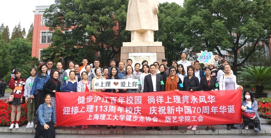 2019年是新中国成立70周年,时值学校113周年校庆,上理工教工健步走协会和版艺学院工会在校工会的指导下,组织了本次活动。版艺学院党委书记、校工会健步走协会会长吴建安作为本次活动的组织者表示,本次活动经过精心策划,以“校庆元素”+“爱国荣校”+“健步运动”为主题,让教工参与健步走活动的同时,增加了爱国荣校教育,加深对校园文化和校史文化的了解,也让更多的教职工参与到113周年校庆活动中。