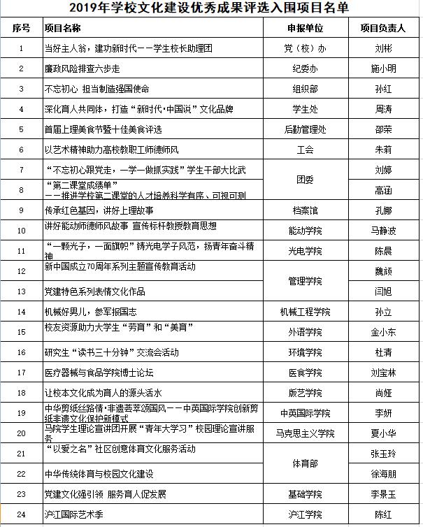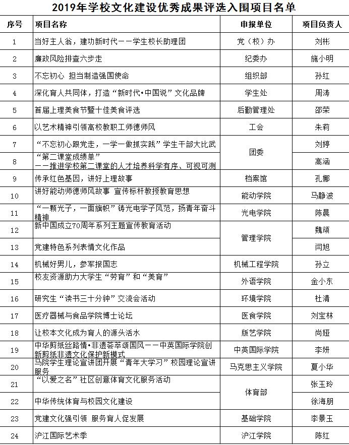 自2019年度学校文化建设优秀成果征集评选工作开展以来,全校各部门踊跃申报,经初审共有24个项目入围,参与2019年度学校文化建设优秀项目成果答辩,入围名单见附件,答辩会具体事宜通知如下:
