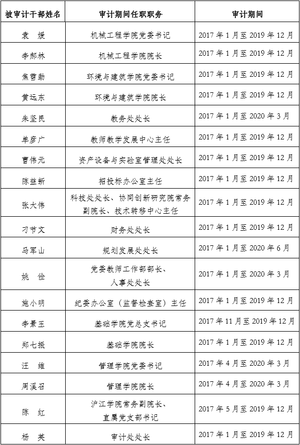 根据《上海市单位内部管理的领导干部(人员)任期经济责任审计实施办法》等文件要求,受学校党委组织部委托,根据学校审计工作安排,将对以下中层干部任职期内经济责任履行情况进行审计。具体名单如下: