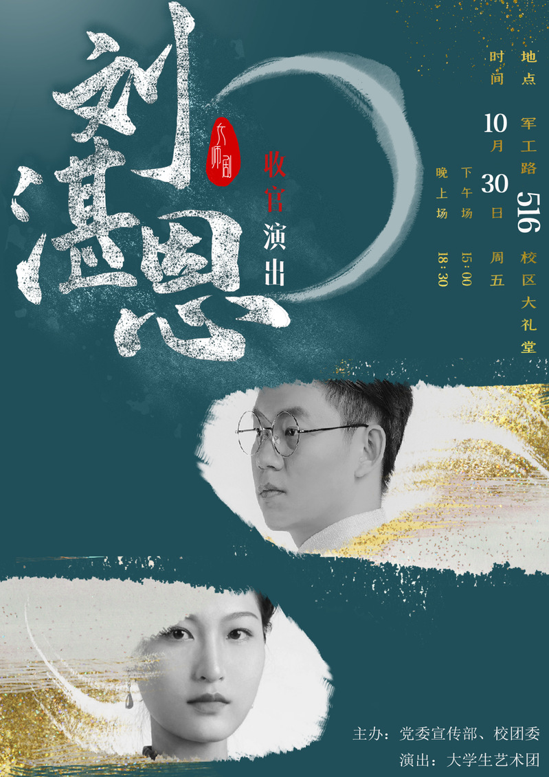 为深入学习“四史”,献礼上海理工大学114周年校庆,演绎大师风范,践悟家国情怀,大师剧《刘湛恩》将于10月30日(周五)再次盛大公演两场。