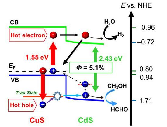 带着这样的疑问,廉孜超教授团队进行了深入研究,创造性地提出使用半金属-半导体性质的硫化铜(CuS)构建半导体异质结,形成良好的等离子体红外到可见能量上转换系统,从而大幅提升红外光利用率,也使氢能的规模化、平价化应用成为可能。