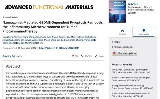 免疫治疗一直是当今医学治疗肿瘤的重要手段,该研究与传统的治疗手段相比,其最大程度上激活了机体自身的免疫机制,阻止了免疫逃避现象的发生,为肿瘤的免疫治疗提供了颠覆性的思路。此次最新成果是上理工与上海交通大学附属新华医院、长海医院联手,研究构建了一种新型的光免疫纳米材料载药体系,通过诱导癌细胞焦亡的方式引起肿瘤部位炎性微环境的改变,增强免疫浸润程度,激活机体免疫应答能力,并且解决免疫检查点抑制剂失效的问题,为黑色素瘤的治疗提供了一种新的方法。