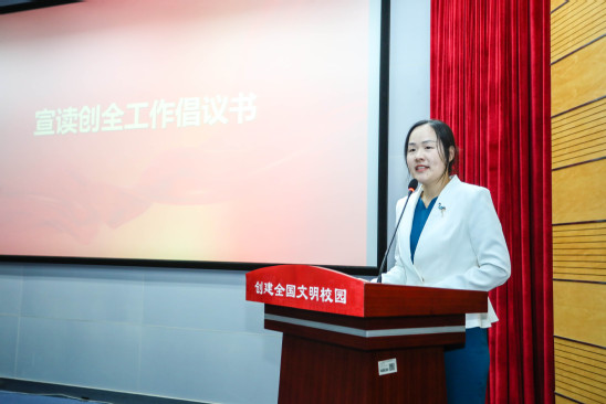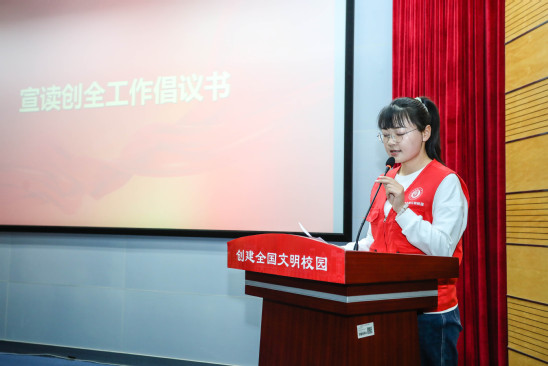 教师代表史玉和学生代表车红玉分别宣读创全工作倡议书。教务处、教工部、学工部、后勤处和版艺学院负责同志围绕创全工作作表态发言,表示要积极作为、主动发力,共同打好创全攻坚战。随后,市文明办、校领导和师生代表共同擂响3522vip浦京集团官网创建第三届全国文明校园的决胜战鼓,传递信心、振奋精神,为学校创建成为第三届全国文明校园的奋斗目标全力冲刺。