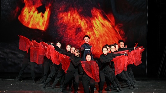 原创话剧《旷野》采用肢体剧的形式,演员一人分饰多角,通过丰富的肢体动作搭建假山、火堆等戏剧场景,模拟真实的旷野环境。通过演员们的肢体表演,表达主人公从内心纠结、恐惧,到逐渐看清前路、明确方向、坚定目标的转变。剧中将主人公的心理变化具象化、可视化,戏剧冲突明显,情感变化清晰,代入感强烈。