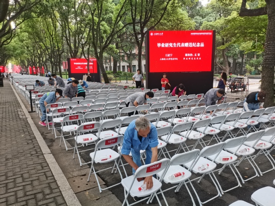 为即将踏上新征程的上理学子上最后一课的,除了上理“大家长”丁晓东校长,还有来自后勤、物业、保卫等毕业典礼外围支持和保障部门的教职员工。6月10日晚7时许狂风暴雨突降校园,上理工后勤、保卫等部门配合典礼会务人员提前采取防护措施,确保屏幕、线缆以及道旗等宣传物料的安全;晚9时30分,暴雨蓝色信号解除,校园安然无恙,但新的问题随之而来:典礼现场几乎所有的座椅上都有积水和飘落的枝叶等异物,无法正常使用。后勤部门连夜部署并于6月11日早上5点45分向所属及协作单位员工发出紧急清理会场的动员令,5分钟后就有第一批人员抵达现场。约1个小时后,在来自北区和南区物业、校园绿化、应急抢修、垃圾分类、防汛防台等单位近30人的奋战以及现场工作人员的协作下,典礼现场近3000把座位清理完毕,保障了典礼的顺利进行。