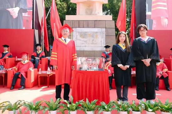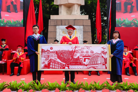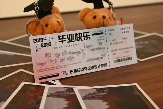 在毕业典礼现场,上理工党委书记王凌宇代表学校,接收了2023届毕业生们为母校精心准备的特殊礼物——3D打印《思晏堂》和非物质遗产剪纸作品《沪江曦韵图》,毕业生们以此向母校表达了拳拳赤子之心。同时,许多学院也为毕业生精心准备了礼物。定格数载回忆的“学士服小熊钥匙扣”,保留最珍贵时光的“校园景观明信片”,记录下人生每个重大决定的“定制笔记本”以及从上理到未来的“前程似锦登机牌”……出版印刷与艺术设计学院的这份毕业礼物承载着对毕业生真挚美好的祝福,“我会将这份礼物作为自己前行的动力和纪念,不断激励着自己努力向前。”毕业生李靖雯难掩收到礼物时的惊喜与激动。