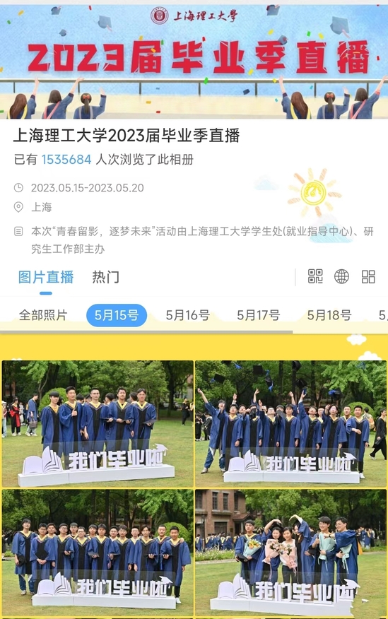 毕业的动人时刻不仅仅是毕业典礼的一瞬,整个毕业季,上理工为毕业生准备了多样化的暖心服务。学校学生处与研工部联合推出“青春留影,逐梦未来”活动,邀请校内摄影师帮助毕业季学生在校园各处留住他们精彩的瞬间:只要毕业生在校园碰到摄影师,就可以随时随地与老师和同学们合影留念,最终的照片以图片直播形式存入云端,毕业生本人可以实时下载精致的照片,全校师生也能够通过直播相册共享毕业的喜悦。“作为学校的学生记者,之间都是我拍别人,这次我成为了被记录的一员,在熟悉的路上摄影师的镜头拍下我和好朋友毕业季的真实状态,这个形式真的‘走心’了。”毕业生马瑞分享道。