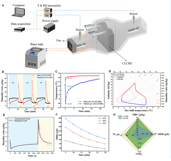 该论文通过复合可得然胶基质和吸湿性盐氯化锂制备得到新型高效复合材料——可得然复合凝胶,对其进行了等温吸附、动态吸附以及循环测试。在相对湿度30% 以及温度 30℃的低湿度条件下,可得然复合凝胶的吸附能力高达2.65 g/g,吸附速率系数k达到1.84 × 10-4 s-1,并且表现出良好的循环稳定性。此外,团队基于优化后的材料,制备成本低廉,制造简单的凝胶基除湿换热器CLCHE,以及搭建针对CLCHE的除湿性能测试实验台并进行实验测试。CLCHE在吸附-解吸循环周期中具有较好的稳定性,通过仅15㎜的CLCHE通道,其进出口空气的露点温度差能够达到30℃,具有强大的深度除湿潜力。