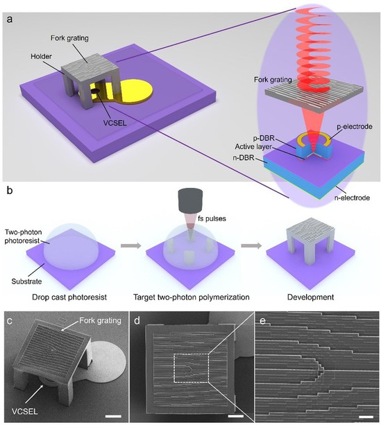 本研究中,作者提出了一种基于激光纳米三维(3D)打印集成轨道角动量相位结构的垂直腔面发射涡旋光激光器,具有体积小、高速度、低阈值、圆形光场、垂直出光、可阵列化的优势。作者通过激光打印微型的轨道角动量相位结构集成在垂直腔面发射激光器表面,从而使激光器发出的高斯光束经过相位结构的调制后变为涡旋光束。激光打印的方法可以扩大轨道角动量相位结构有效光照面积,从而可增大空间带宽积。同时,激光3D打印比此前方法具有较高的制造效率,单个器件的打印仅约为20分钟,而此前方法约为数小时。文章中,作者实现了拓扑荷数从1到5的可寻址涡旋光激光器阵列,单个器件尺寸仅约为100微米×100微米。