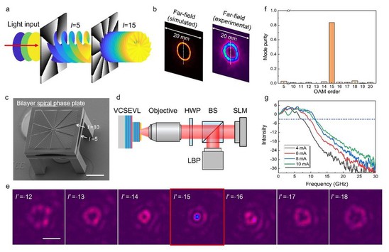 本文中作者通过设计3D结构的、级联的螺旋相位板(SPP)进一步来提高空间带宽积,成功实现了最大拓扑荷数为15的涡旋光束。该研究解决了微型涡旋光激光器拓扑荷数提高的问题,有望推动轨道角动量信息复用技术的小型化、集成化发展。
