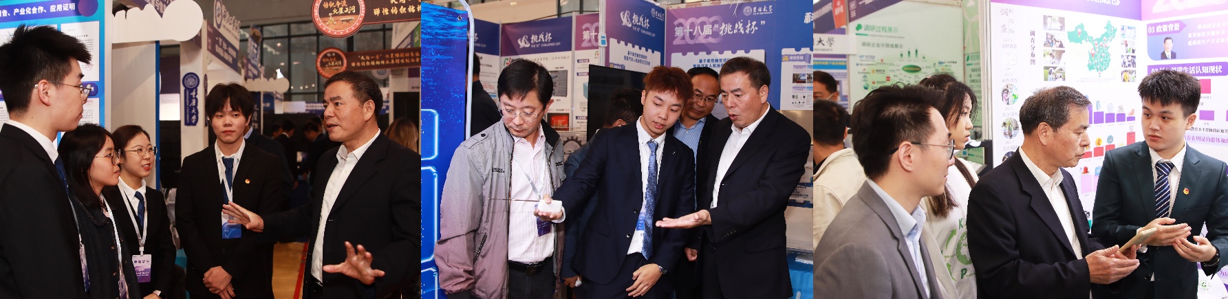 在大赛期间,校党委副书记、副校长盛春现场慰问了参赛团队,与每一位师生进行深入细致地交流,详细询问参赛作品的准备情况,对团队指导老师的辛勤付出和团队成员的努力拼搏表示充分的肯定与感谢,鼓励同学们沉着应对、全力以赴,在“挑战杯”的大舞台上展示浦京官网学子开拓进取的精神风貌,并预祝大家取得好成绩。校团委书记刘威、创新创业学院及各项目所在学院领导、学院团委负责人到现场为参赛团队做好坚实保障,并为参赛师生加油打气。