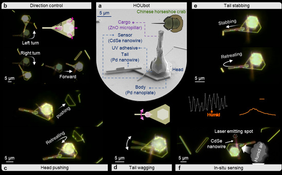 研究人员又利用金属钯纳米片为底盘搭建了一个结构更复杂、功能更多样的纳米机器人,因形似中华鲎,被称为HOUbot(图4a及视频)。该机器人能像汽车一样自由移动 ,并做出头部推动、独立尾部摇摆和戳刺等更高自由度和精细的动作。机器人身上搭载半导体纳米线可用于原位湿度传感。由于其相对较大的表面,该机器人具有很强负载能力,理论有效载荷可以达到毫克量级(相当于一只蚂蚁的质量)。通过采用现有的宏观机械设计来装备更多的机载组件或货物,HOUbot可以像宏观机器人一样工作,是世界首个利用传统机械手段实现的可执行具体任务的纳米机器人。