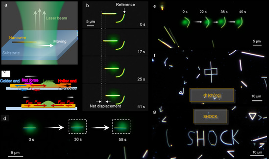 捕获(Trapping)特性是激光操控技术的核心,因为它可以通过光斑位置来掌握粒子的动向,实现任意的运动控制,而不仅仅止步于缺乏控制的致动(Actuation)。金纳米线在532nm纳秒脉冲的高斯型光斑作用下,会向光斑内部移动,直到纳米线的中心与光斑中心一致,这是一个典型的捕获过程。研究人员通过理论分析,找到了光热冲击驱动力的物理来源,因表达式中包含温度梯度,因此该力被称为光热梯度力。当移动光斑时,光热梯度力分布平衡被打破,纳米线重新向光斑中心移动,一直重复该过程,纳米线就会随着光斑一直轴向移动。另外对被捕获在光斑中央的纳米线,提高激光功率将会使纳米线两端受到更大光热梯度力挤压而侧向弯曲,从而实现侧向移动。这样就实现了纳米线在二维平面上的任意运动。如下图展示了研究团队将多根纳米线拼成汉字“冲”和英文单词“SHOCK”的图案。