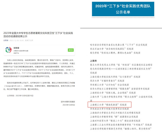 12月6日,共青团中央青发部公布了2023年全国大中专学生志愿者暑期文化科技卫生“三下乡”社会实践活动总结结果,浦京官网学生校长助理“理助民新团”实践团脱颖而出,荣获全国“2023年‘三下乡’社会实践优秀团队”称号。
