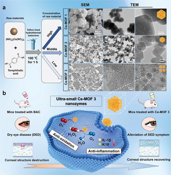 据了解,利用广谱抗氧化剂消除活性氧可能是一种可行的干眼病治疗方法,具有超小粒径(如粒径<10 nm)的纳米颗粒通常表现出更高的药物递送、活性氧清除和治疗效果。受此启发,李贵生教授团队研发出了一种工程化的超小型铈基金属有机框架(Ce-MOFs)纳米酶。选用水热合成法,分别以硝酸铈铵和苯二甲酸作为铈源和有机配体,成功设计出了不同粒径的Ce-MOFs。这种Ce-MOFs能够模拟超氧化物歧化酶和过氧化氢酶的功能,有效清除眼部过量的活性氧。更重要的是,粒径为2-3纳米的Ce-MOFs纳米酶能有效穿透眼组织,进入常规药物难以到达的深部组织,从里到外更充分地发挥抗氧化作用,进而加速受损角膜上皮的修复过程。论文一经发表即引起了学术界和公众的广泛关注,中新网、光明网、新浪网、网易、凤凰网、文汇报、新民晚报、腾讯网、科学网等主流媒体都进行了专题报道或转载评论。