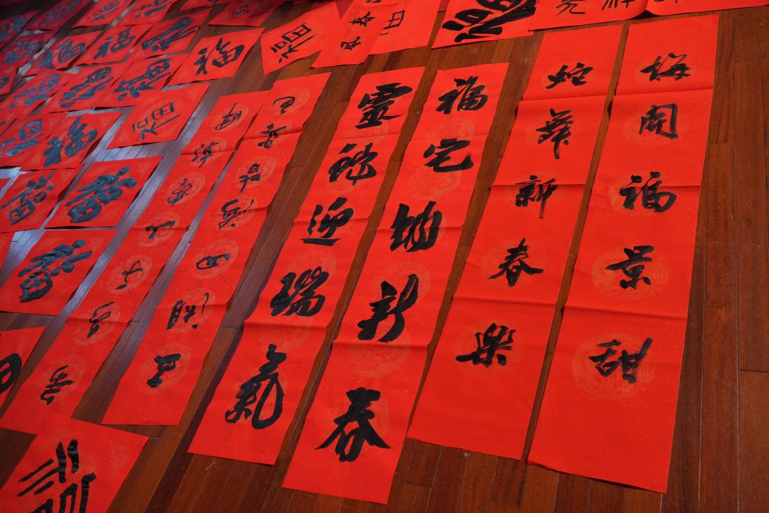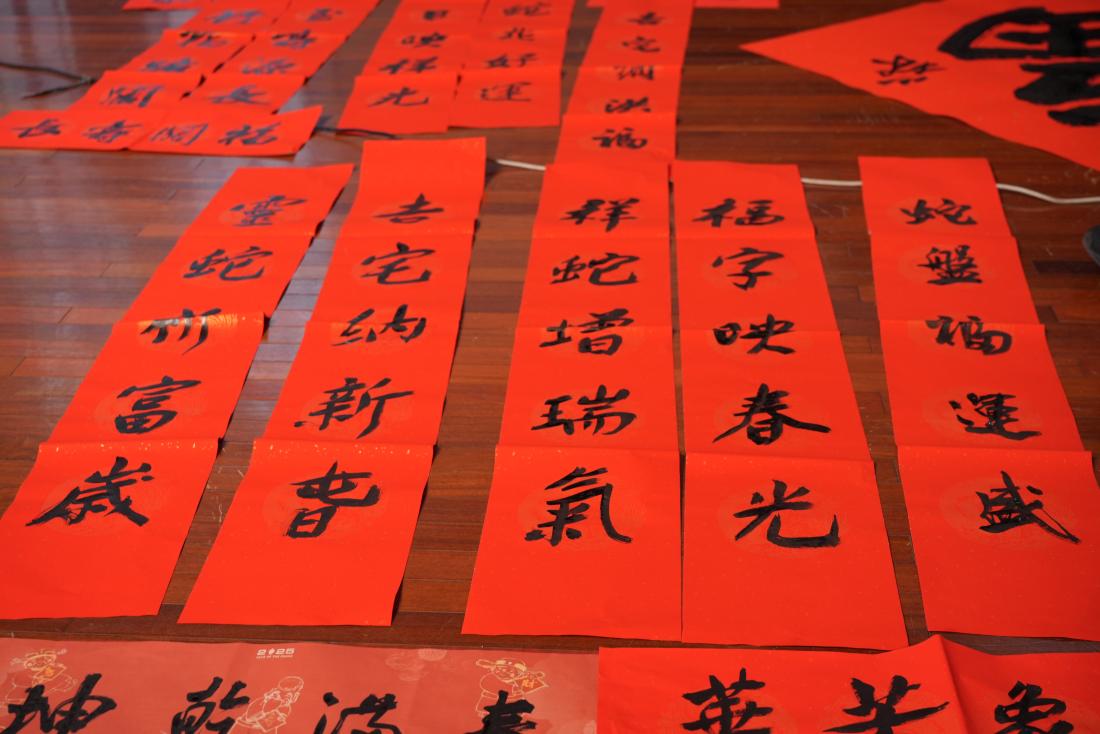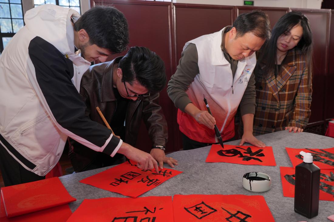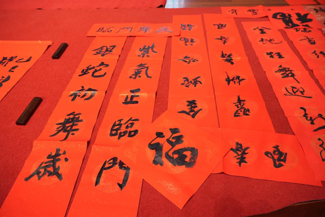 活动现场气氛热烈。十余位书法家笔酣墨饱,洋洋洒洒书写春联,一笔一划间,满心的祝福和美好的愿望跃然纸上。万福迎春红红火火,现场的留学生也对中国书法表现出浓厚的兴趣。他们积极与书法家互动创作,在专业指导下,写出了一个个气韵生动寓意美好的“福”字,于一番酣畅淋漓的创作之中春风得意欢声笑语,实实在在地深度体验了中国书法艺术的魅力与精彩。