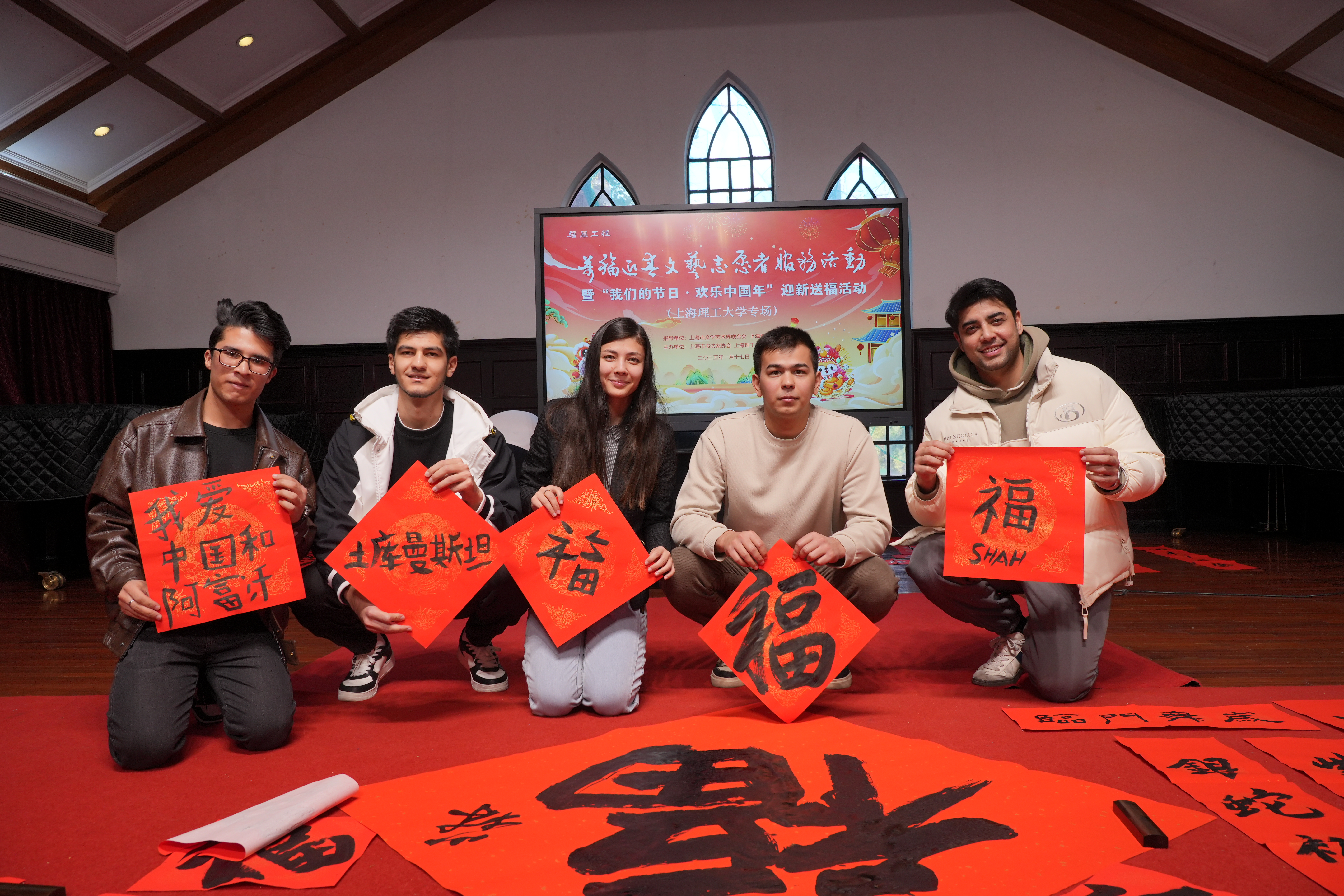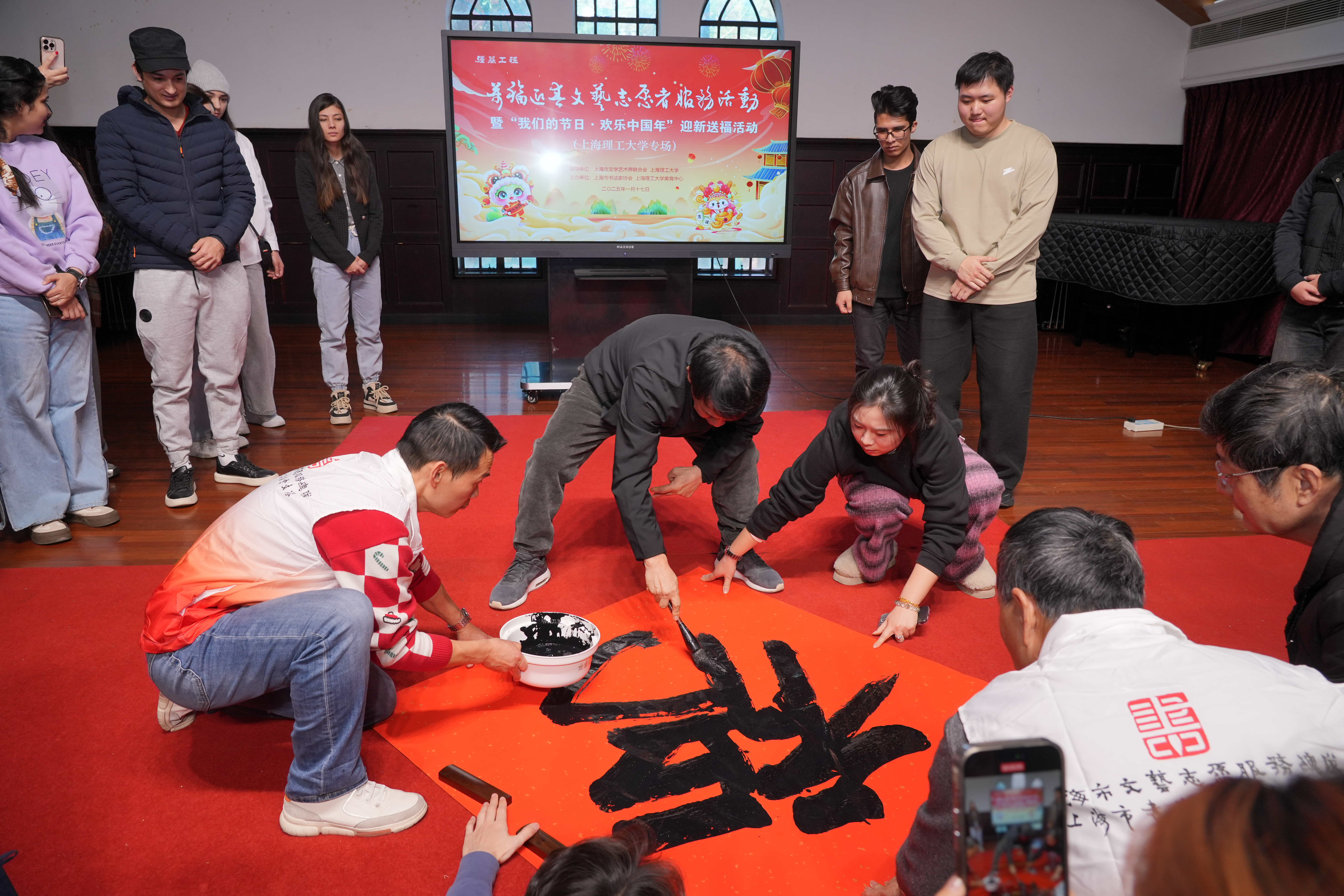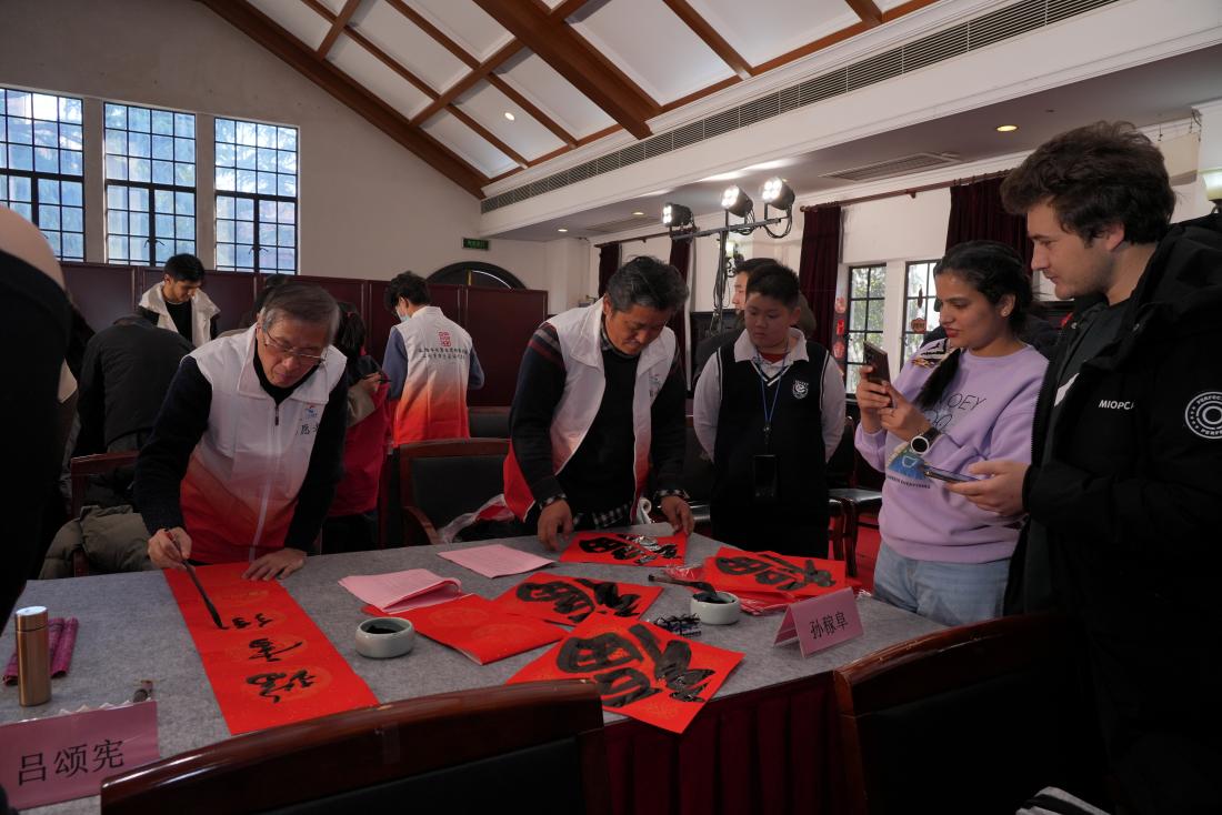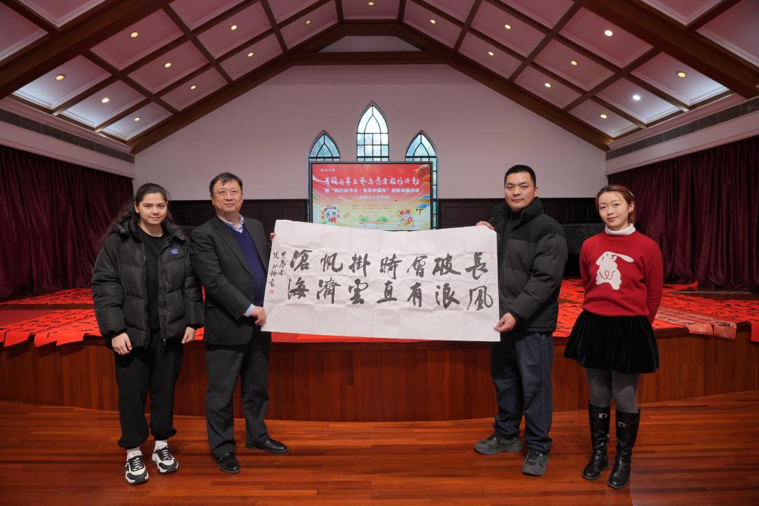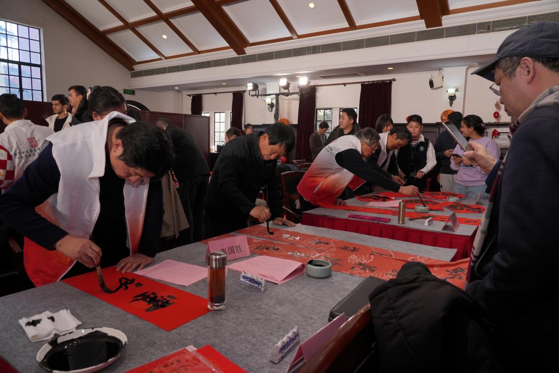 1月17日下午,上海市书法家协会代表团走进3522vip浦京集团官网,在音乐堂挥毫泼墨,为浦京官网师生书写春联传递情谊,共同喜迎乙巳新春。浦京官网美育中心主任、沪江学院常务副院长陈红,美育中心专职副主任、沪江学院副院长朱慧锋,沪江学院教师以及中外学生代表出席活动,沪江学院书法教师董剑戟主持活动。