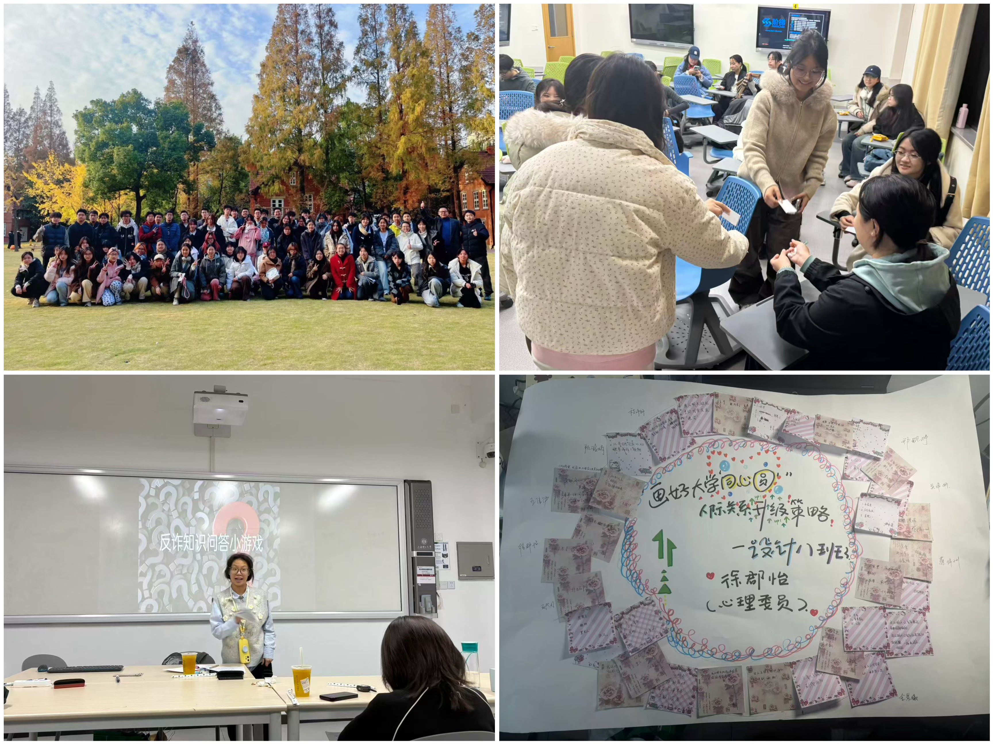 多元形式,打造沉浸式班会体验。班会打破“一人讲、众人听”的传统模式,各班级创新采用案例分析、情景模拟、小组辩论、嘉宾分享、互动游戏等形式,提升班会参与度与实效性。如“破冰与融合”主题中,通过班级联合开展素质拓展、团队协作游戏快速建立班级凝聚力;“学术规范与学风建设”中,引用案例开展研讨,为低年级做好学风建设打牢基础;在“我的大学‘坐标系’——职业生涯规划启蒙与目标管理”主题中,各班级引入生涯九宫格、SWOT分析等工具,引导学生绘制个人成长蓝图。“创意点亮未来”主题中,班级自主设计特色项目,形成“一班一特色”的生动局面。多元形式的碰撞,让班会从“任务”变为“期待”,真正成为学生主动参与、深度思考的成长平台。